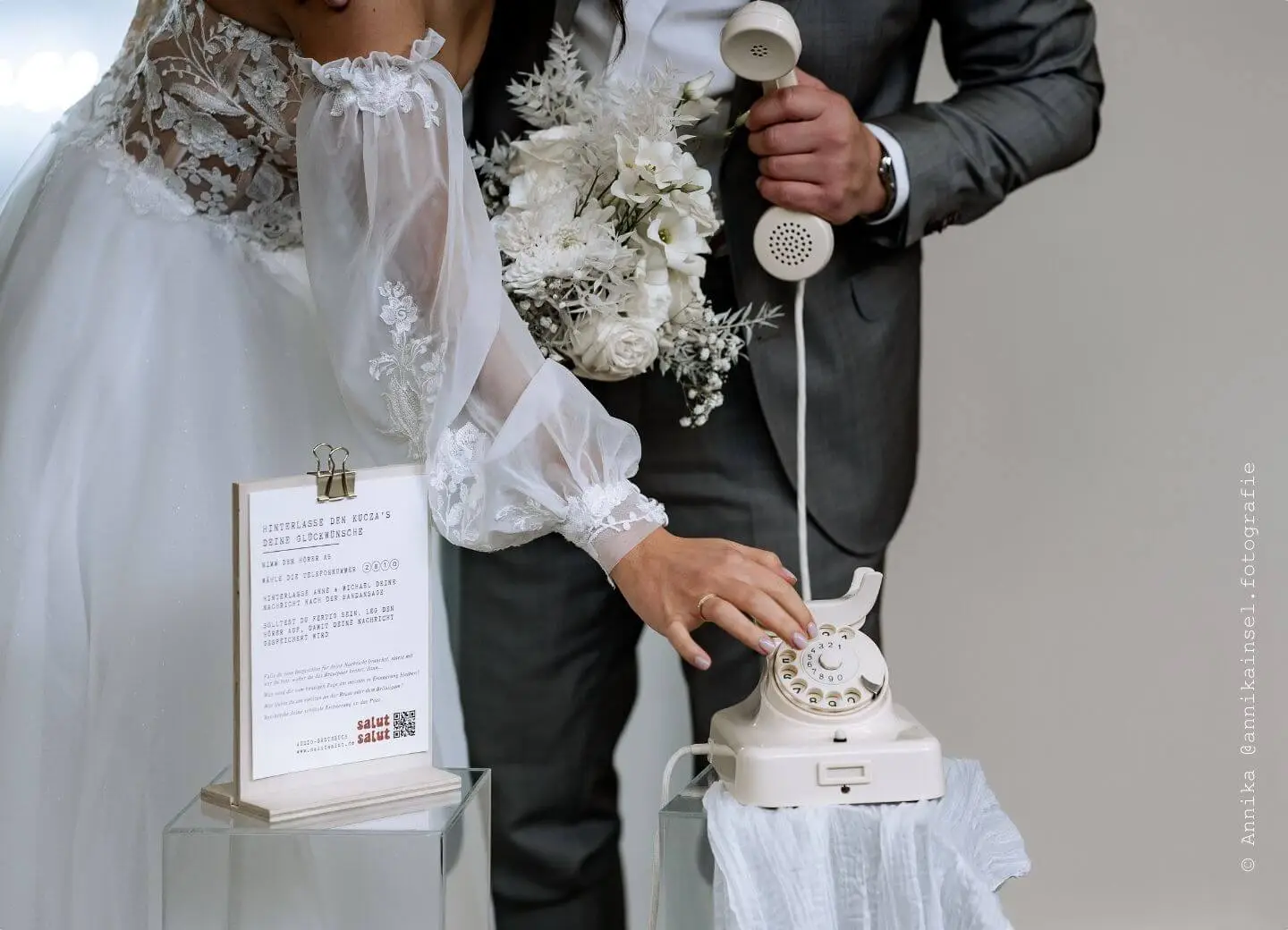 Eure Gäste können euch mit unseren außergewöhnlichen Telefonen bei eurer Hochzeit ihre Glückwünsche als Sprachnachrichten aufzeichnen. Dies ist eine wunderschöne Alternative zur klassischen Variante mit Stift & Papier.